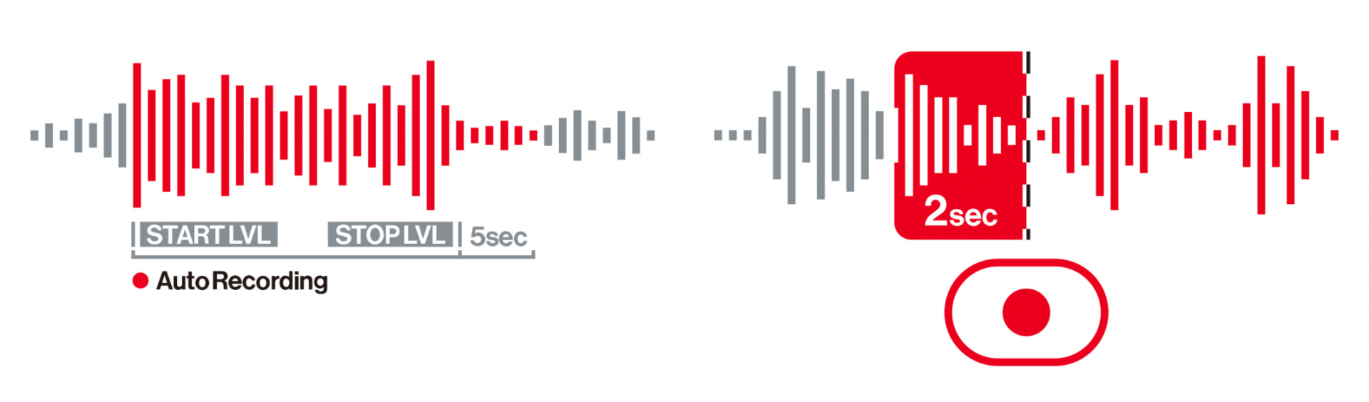 자동 녹음 기능은 소리 입력 신호 레벨을 감지하고 자동으로 녹음을 시작할 수 있습니다. 프리-레코딩 기능으로 2초의 시간을 제공해 충분한 레코딩 준비 시간을 제공합니다.