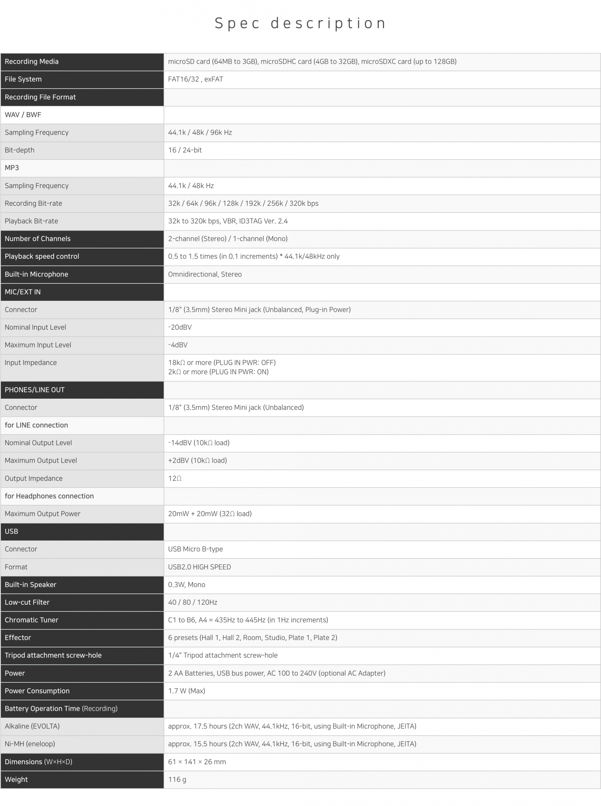 DR-05X는 AA 건전지 2 개를 사용하며 장시간 배터리수명을 제공합니다. 내장 마이크를 사용하는 경우 알카라인 배터리를 사용하여 표준 2ch WAV, 44.1kHz / 16bit 포맷으로 녹음 할 때 기록은 17.5 시간 지속됩니다.
