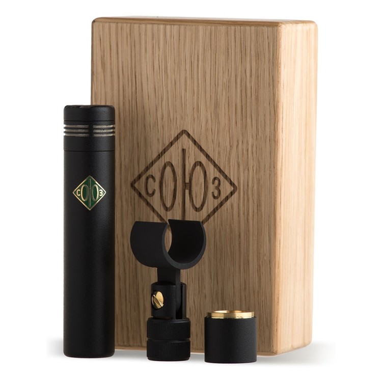초록색 배지가 특징인 013 FET 마이크는 -10dB 패드 및 마이크 클립과 함께 목재 케이스에 담겨 제공됩니다.