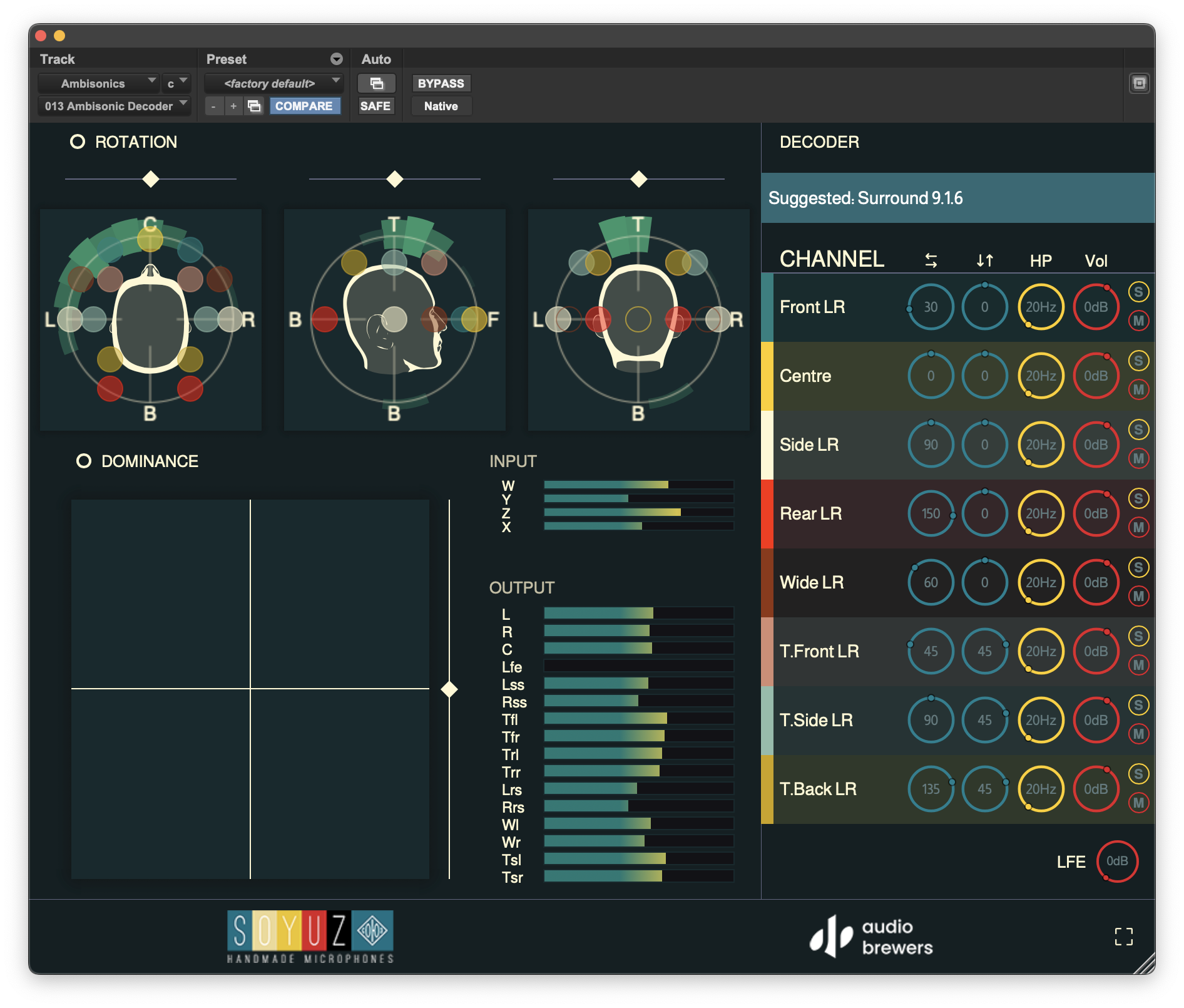 013 Ambisonic Decoder를 사용하면 손쉬운 사운드 셰이핑이 가능합니다. '로테이션' 및 '도미넌스'와 같은 포함된 컨트롤은 사운드를 모든 방향으로 이동하거나, 특정 요소를 강조하거나 탐색할 수 있는 간단하고 직관적인 툴을 제공합니다.