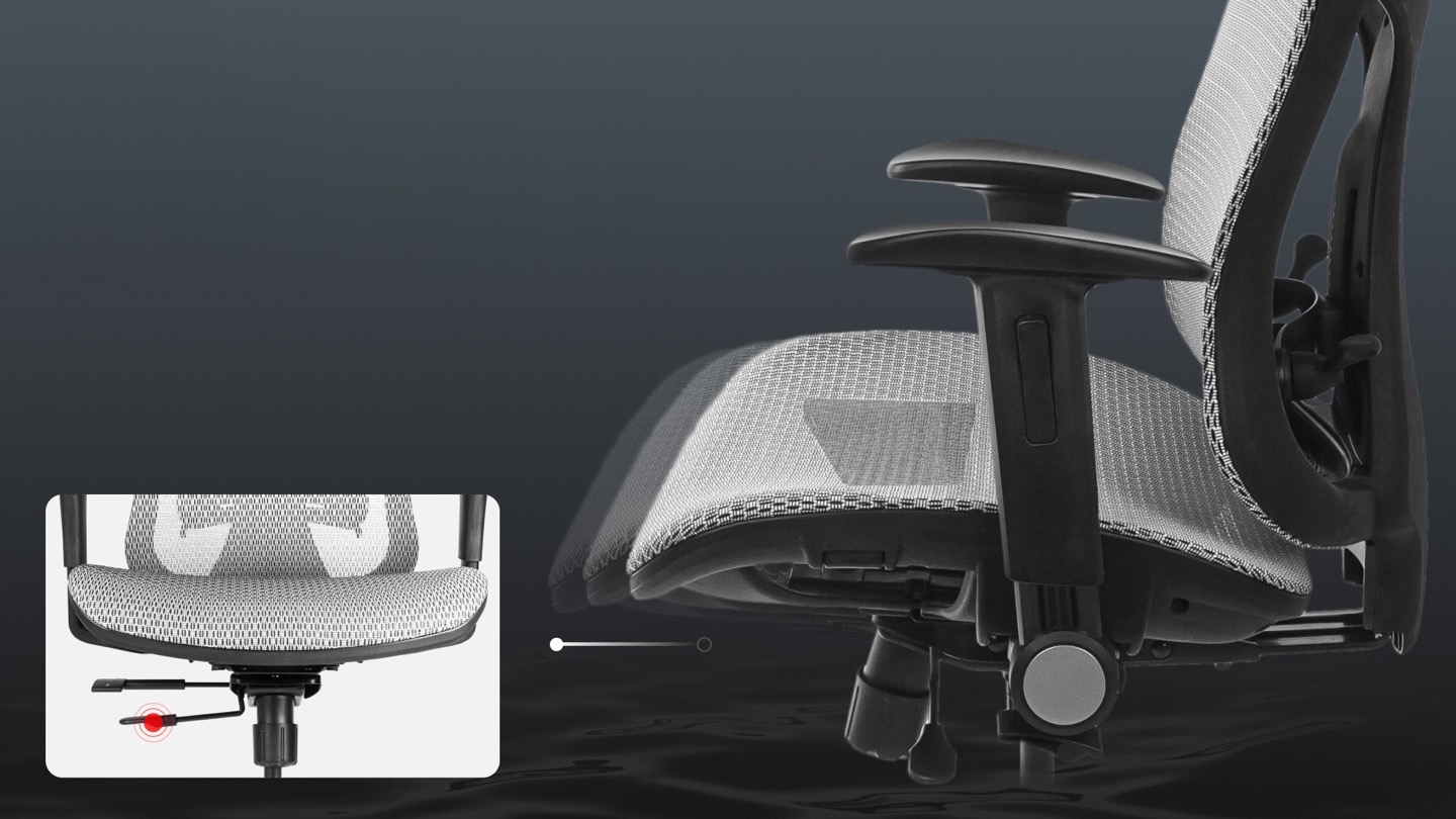 필요에 다라 좌석 시트를 깊거나 얕게 조절할 수 있습니다. 상체를 등받이에 완전히 지지하고 아래의 핸들을 당기기만 하면 다리에 가해지는 압력을 완화할 수 있도록 시트 깊이를 조절할 수 있습니다.