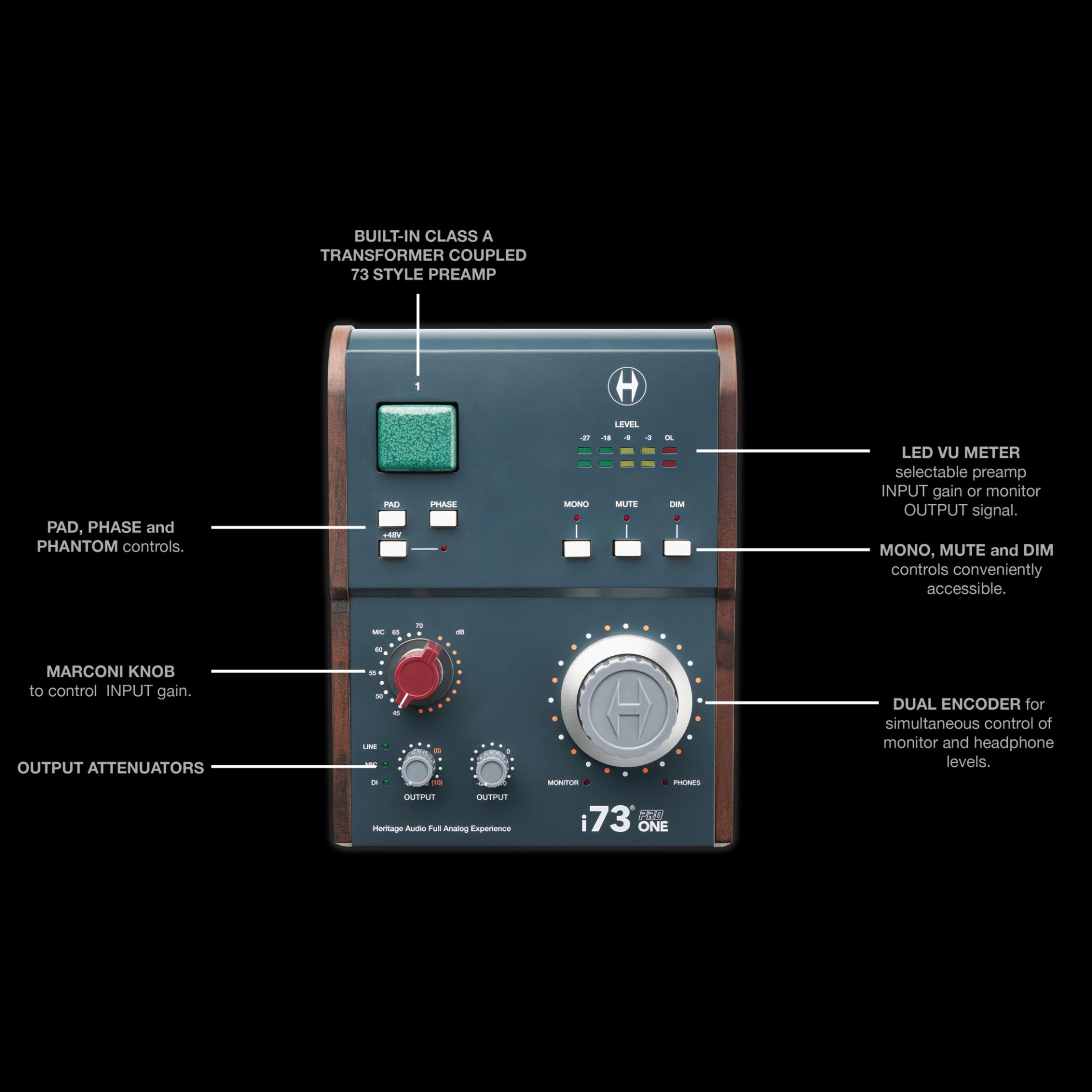순수 Class-A 73 스타일 프리앰프가 내장된 Heritage Audio /헤리티지 오디오/의 i73® PRO /i73 프로/ 시리즈 USB-C 오디오 인터페이스를 통해 레코딩 황금기의 완전한 아날로그 사운드를 언제 어디서나 누릴 수 있게 되었습니다.