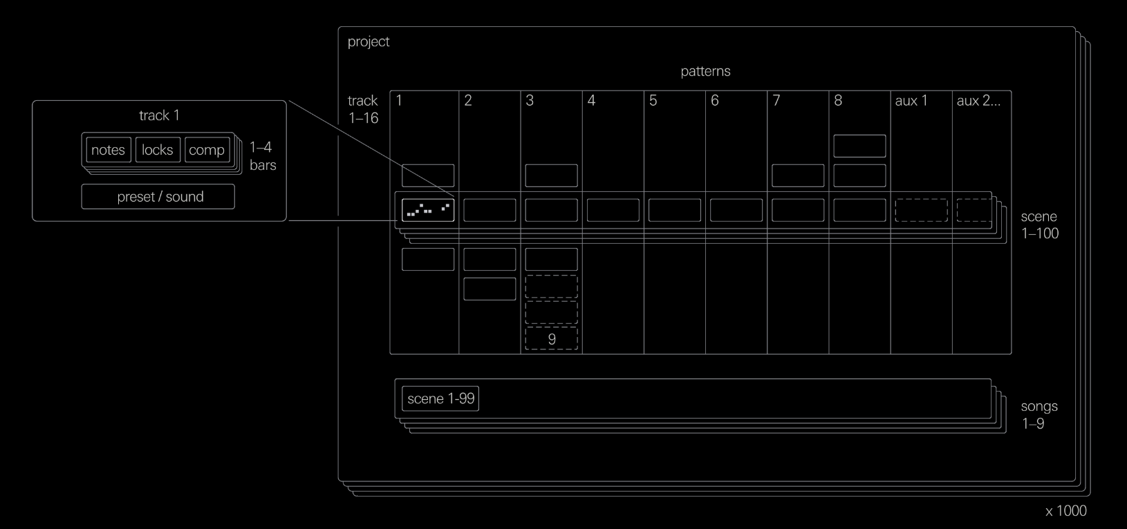 모든 트랙을 각기 다른 속도와 길이로 독립적으로 실행하여 강력한 폴리리듬을 형성하고, 스텝 구성 요소를 사용하여 매번 새로운 시퀀스를 들 수 있습니다. 시퀀서의 모든 스텝에 추가할 수 있는 변형, 바리에이션을 통해 피치 변경부터 벤딩, 스킵 또는 더블-타임까지 모든 것을 제어할 수 있습니다. OP-XY가 제공하는 시퀀싱 기능은 다음과 같습니다.