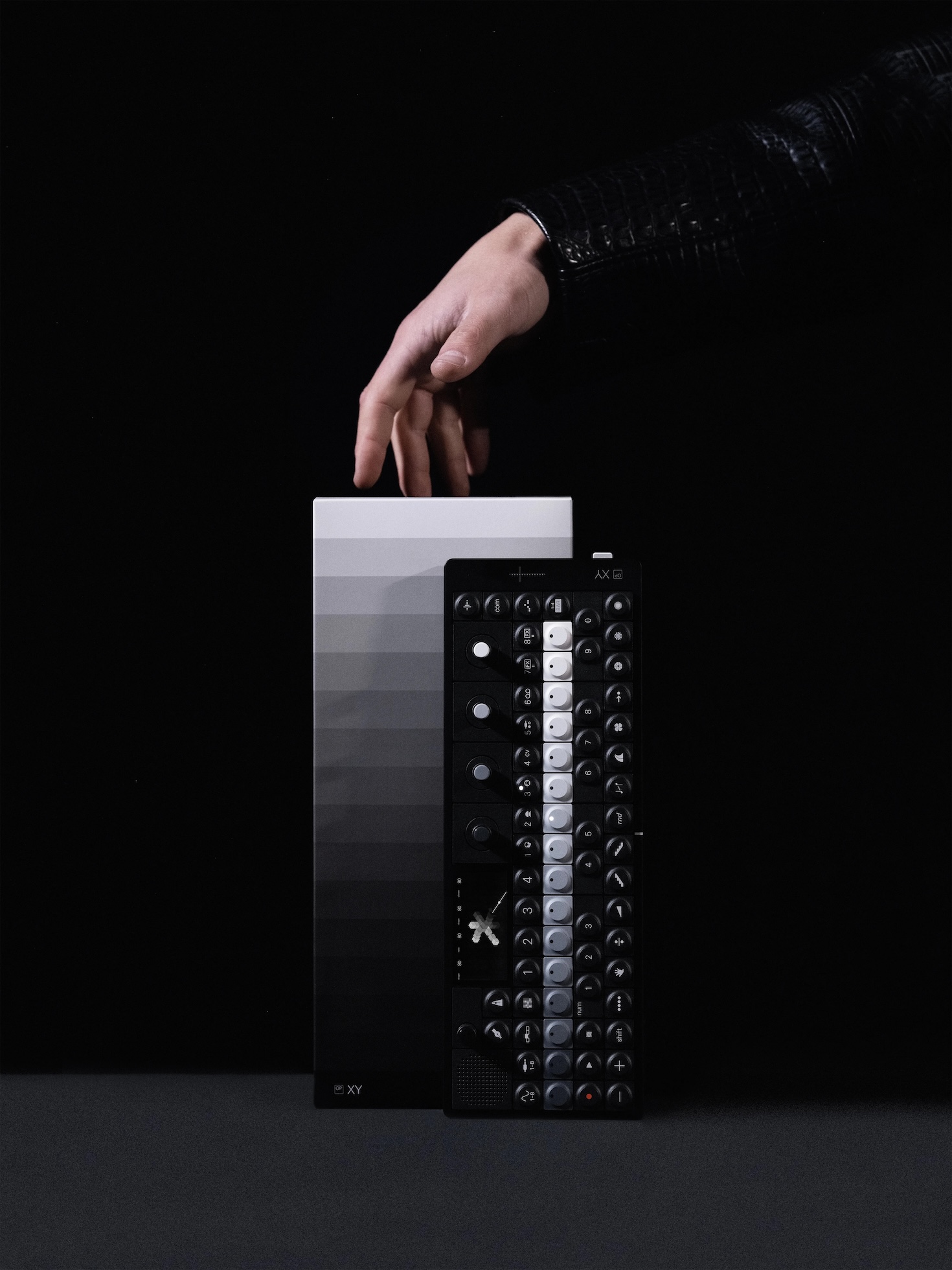 OP-XY의 디자인은 블랙 컬러로 구성되어 있으며, OP-1 field /OP-1 필드/와 같은 포맷을 공유합니다. 중앙 부분엔 회색조의 그라데이션이 있어 OP-XY가 얼마나 시퀀싱에 집중되어 있는지, 그 능력을 갖추고 있는지를 암시합니다. 고해상도 디스플레이의 핸즈온 그래픽은 모두 회색조로 디자인되었으며, 밝게 빛나는 빨간색 인디케이터는 파라미터 잠금을 표시합니다. 또한 모든 핵심 키에는 완벽한 컨트롤을 위한 LED가 포함되어 있습니다. 매우 미니멀한 디자인이죠. 게다가 매우 효율적이고 섹시하기까지 합니다.
