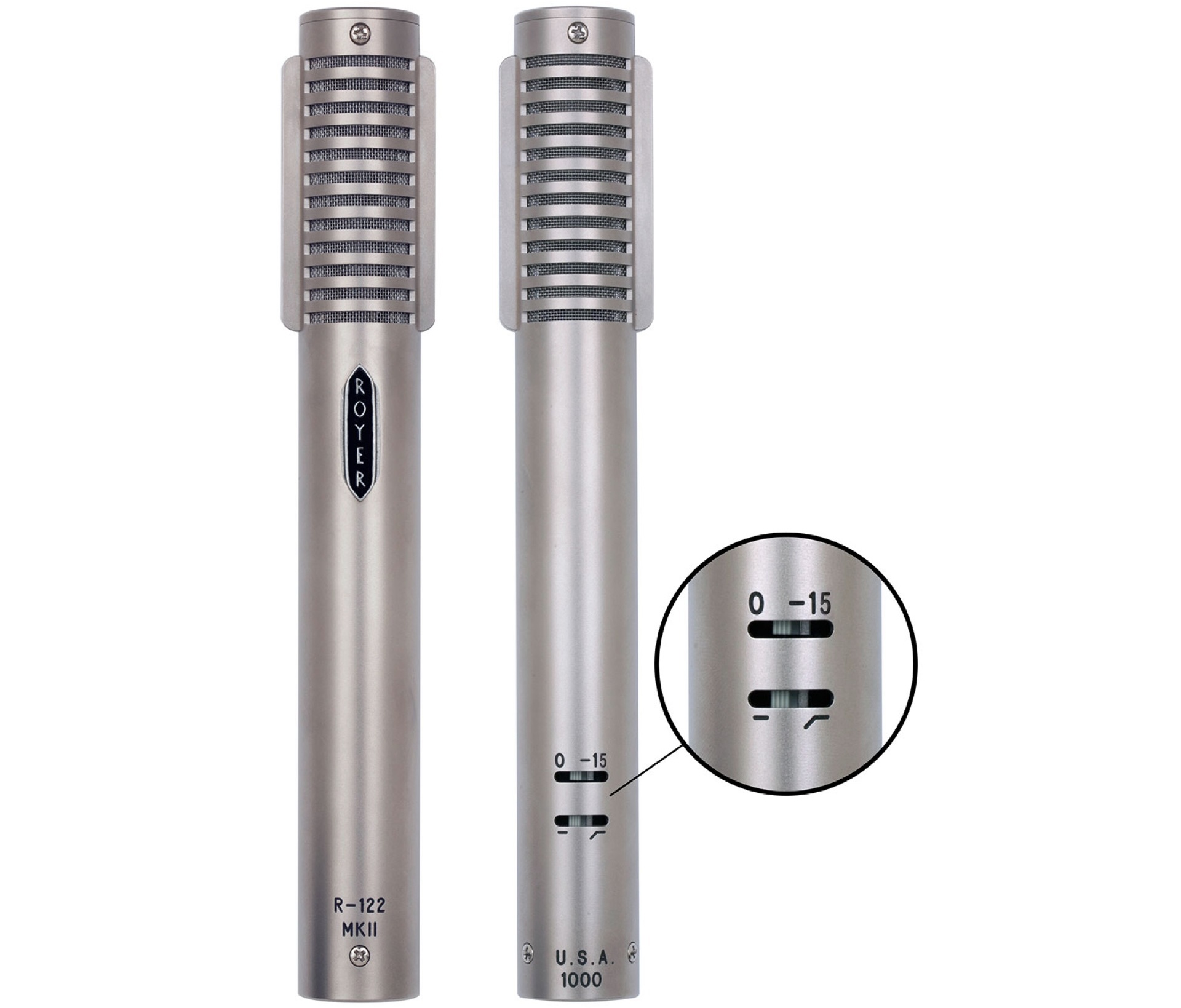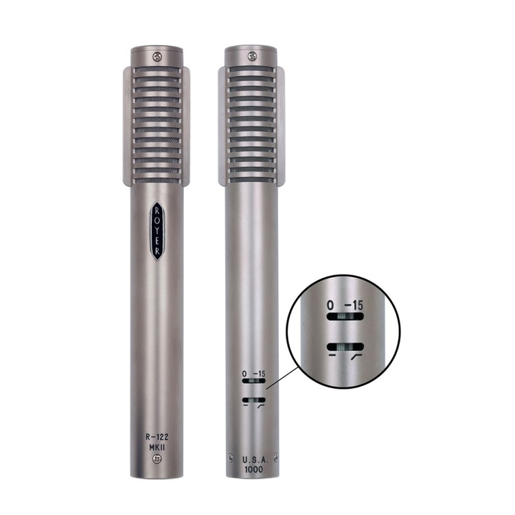 R-122 MKII는 R-122를 한 단계 발전시켜, 켜고 끌 수 있는 -15dB PAD와 베이스 컷 필터 스위치를 더해 비교할 수 없는 유연성을 보여줍니다. 이 스위치을 모두 껐을 경우에는 회로와 전혀 연결되지 않아 기존의 R-122처럼 사용할 수 있습니다. 스위치는 마이크의 후면에 위치하고 있어서 실수로 건드리는 일을 방지했습니다.