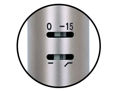 스위치를 넣으면, R-122 MKII의 베이스 컷이 100Hz에서부터 6dB/Oct로 필터링하여, 근접 효과로 인해 베이스 음역대가 과장되는 것을 효과적으로 줄일 수 있습니다. 이 부드러운 필터는 특히 저역대가 별로 필요하지 않은 보컬, 어쿠스틱 악기, 가까이 마이킹한 일렉트릭 기타에 유용합니다.