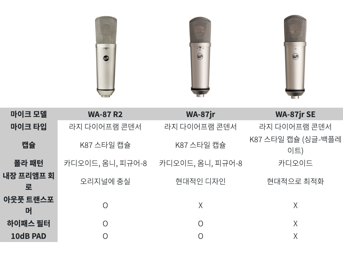Warm Audio의 모든 장비와 마찬가지로 WA-87jr 역시 미국 텍사스 오스틴에서 숙련된 기술자들이 직접 꼼꼼하게 핸드 테스트와 검수를 거쳐 제작됩니다. 음악에 대한 열정을 바탕으로 제작된 WA-87jr는 전설적인 87 스타일 마이크 사운드를 현대적으로 구현하면서도 트랜스포머리스 회로 설계와 빈티지 K87 캡슐을 통해 깨끗한 고음역, 섬세한 중음역, 풍부한 아날로그 톤을 제공합니다. 세 가지 폴라 패턴, PAD와 필터 기능, 울트라 로우-노이즈 설계, 넓은 다이내믹 레인지 등 전문적인 레코딩 기능을 합리적으로 제공하는 WA-87jr은 스튜디오 보컬 레코딩을 위한 가장 인기 있는 마이크 중 하나의 사운드를 누구나 경험할 수 있도록 만든, 시대를 초월한 마이크입니다.