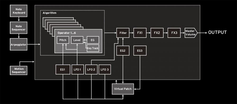 신호 패스를 재배치하여 사운드를 변경하는 신서시스 방식입니다. 알고리즘 섹션을 통해 오퍼레이터 간의 신호 라우팅 방식을 변경하여 사운드를 극적으로 재구성할 수 있으며, 실제 세미-모듈러 신스와는 다르게 별도의 패치 케이블은 필요하지 않습니다.