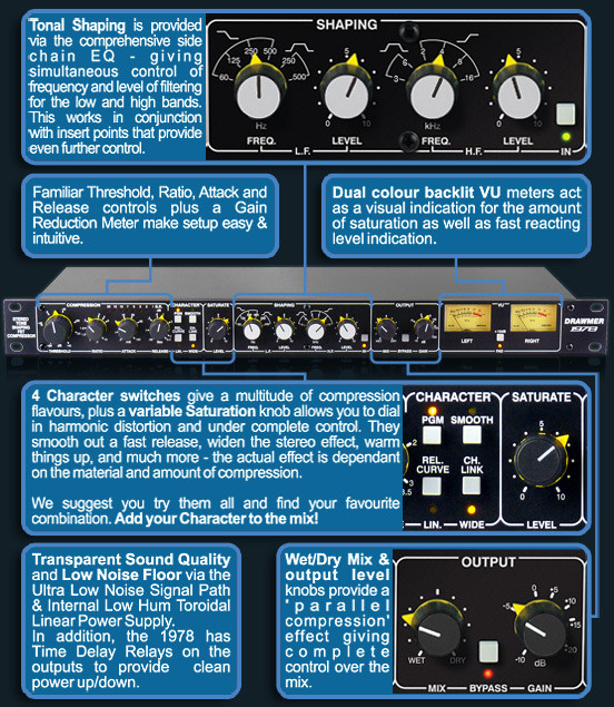 빠른 응답을 가지는 두가지 색상의 백라이트 VU 미터를 사용하여 추가되는 세츄레이션 상태를 시각적으로 표시합니다. 지연시간두고 반응하는 전원 릴레이를 사용하여 팝 노이즈 없는 전원 온, 오프 기능을 제공하고 있으며 낮은 험(Hum)노이즈를 가지는 트로이달 트랜스(권선트랜스)를 가지고 있습니다. Drawmer 1978은 영국에서 엄선된 부품으로 사용하여 제작하고 있습니다.