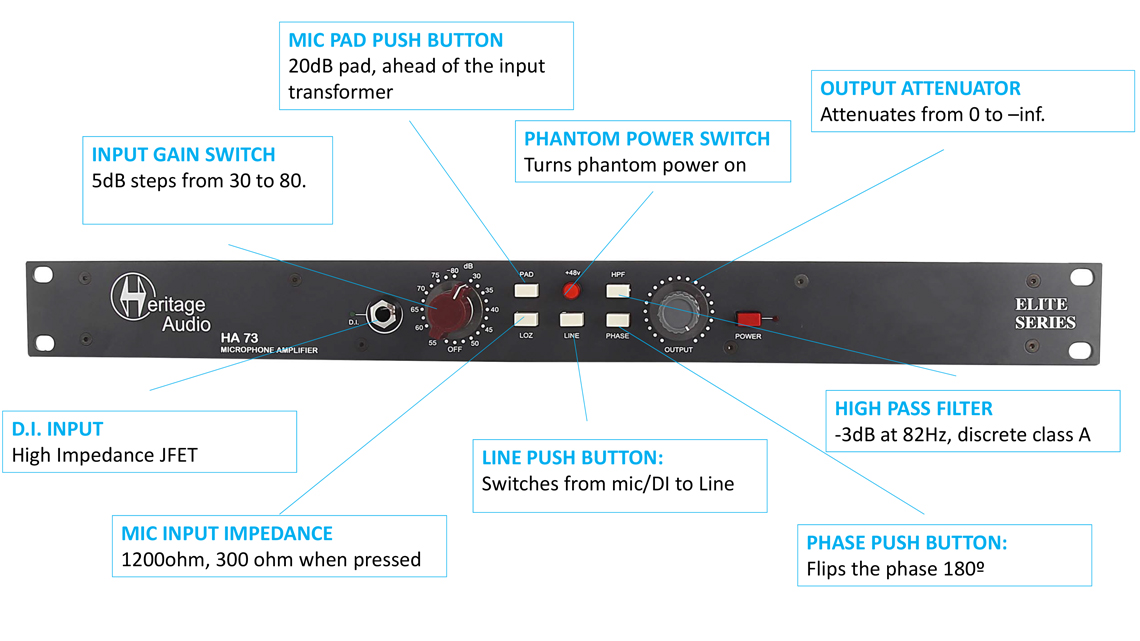 HA73 Elite에는 게인, 아웃풋 트림, -20dB 패드, 위상 반전, 하이패스 필터, +48v 팬텀 파워가 제공됩니다. 1U 사이즈 British 철제 섀시로 튼튼하게 마감되었으며, 낮은 노이즈를 실현하기 위해 외부 파워 서플라이를 사용합니다. HA73 Elite에는 Carnhill 인풋/아웃풋 트랜스포머와 고품질의 노브와 스위치가 사용되었으며, Heritage Audio에서 100% 제작하였습니다.