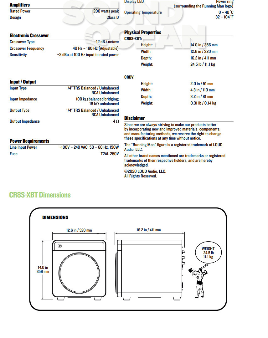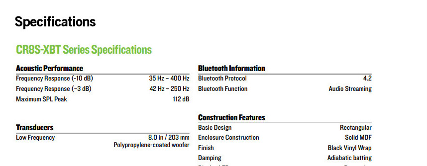 CR시리즈에는 서브우퍼인 CRS-XBT가 있습니다. 200W 앰프와 고출력 8인치 우퍼는 여러분이 찾고 있던 저음을 제공합니다. 포함된 CRDV 데스크탑 리모컨은 서브우퍼용 볼륨 노브를 제공하고 책상에서 바로 모니터 할 수 있습니다. 또한 블루투스 연결 기능을 갖추고 있어 모든 모니터 페어에 연결하고 즉시 스트리밍 할 수 있는 시스템을 가지고 있습니다.