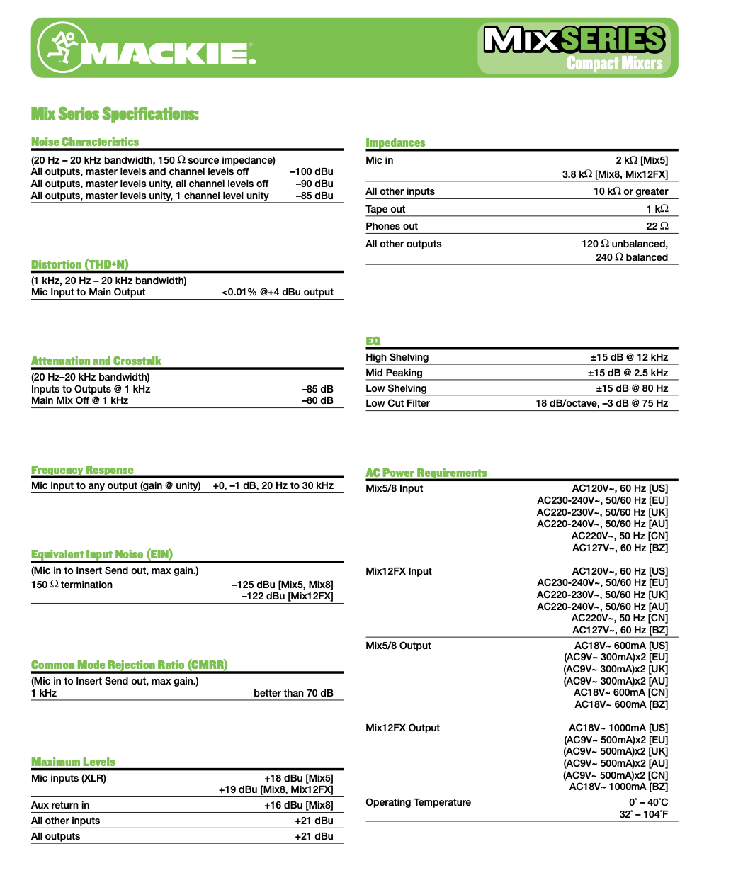Mix 시리즈는 세계적으로 컴팩트 믹서 디자인의 선두 업체인 Mackie에서 고안하고, 입증된 매우 견고한 믹서 입니다. Mackie 자체 프리 앰프와 함께 높은 헤드룸, Low-noise 설계로 고안된 Mix 시리즈는 어떠한 소스 입력이라도 훌륭한 사운드를 제공합니다. 또한, 견고한 메탈 샷시와 고품질 소자를 통해 좋은 품질의 제품을 구현해 냅니다. 이런 놀랄만한 기능을 갖춘 Mix 시리즈는 여러 현장에 간편하고 쉽게 다가갈 수 있다는 장점을 제공하고 있습니다.